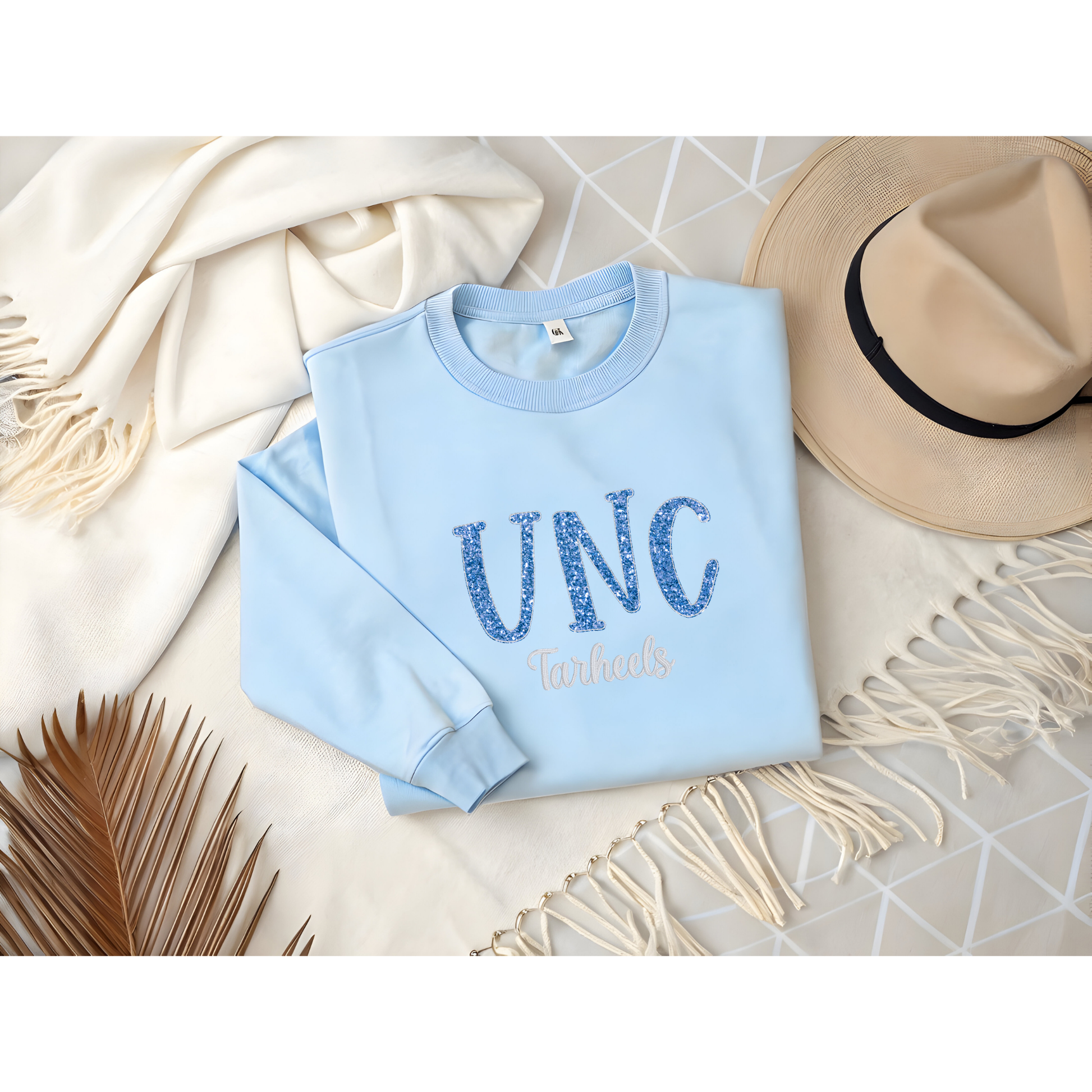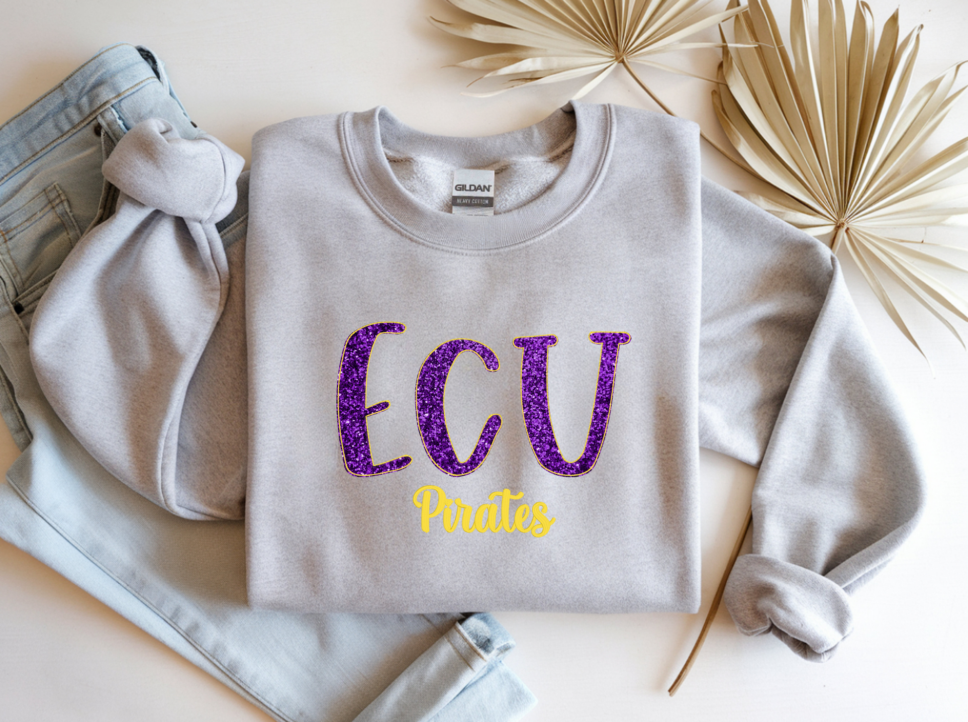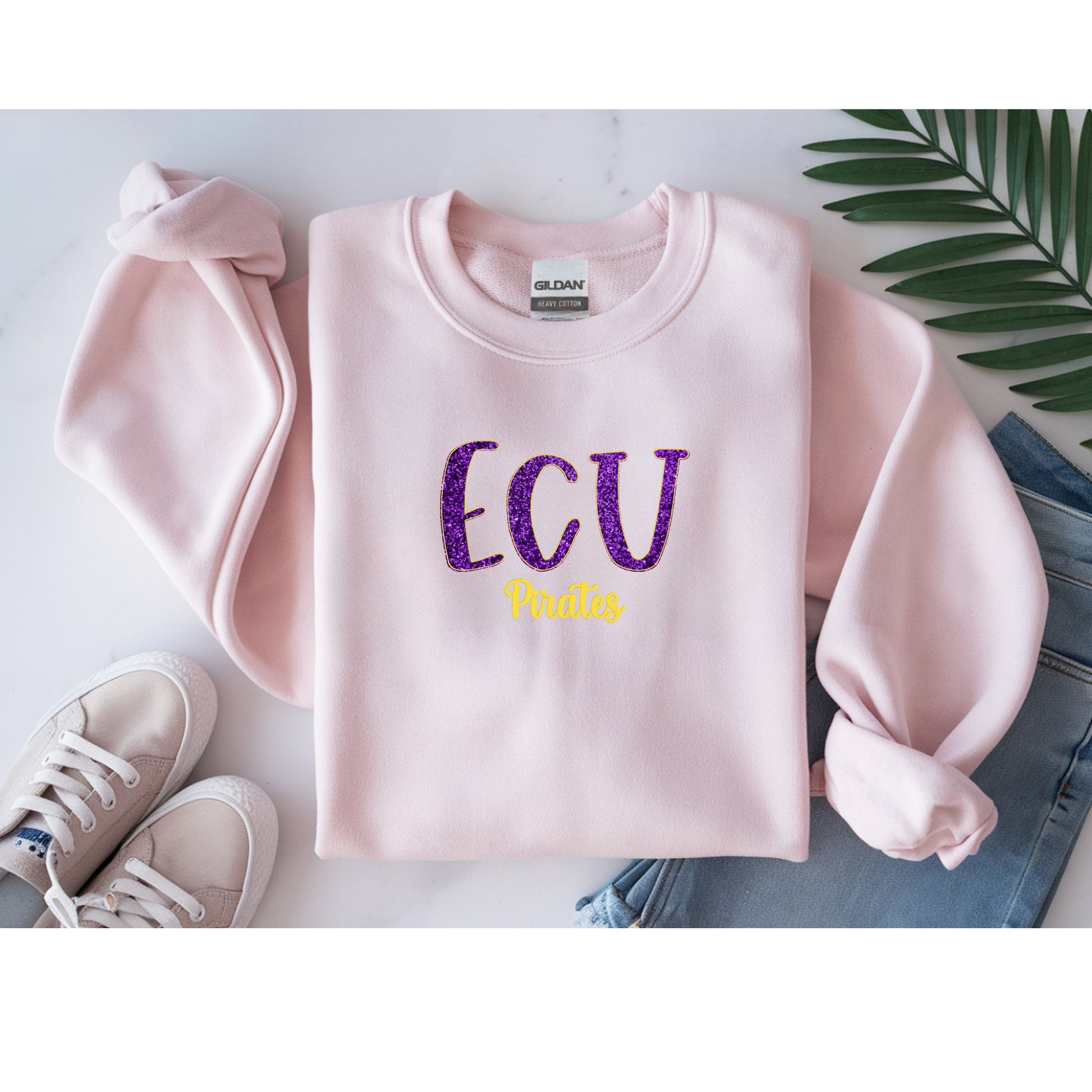 - After that, in the text box, please specify your desired school initials (ex. ECU Pirates), thread color for accent to the initials and mascot, and glitter color for the initials.