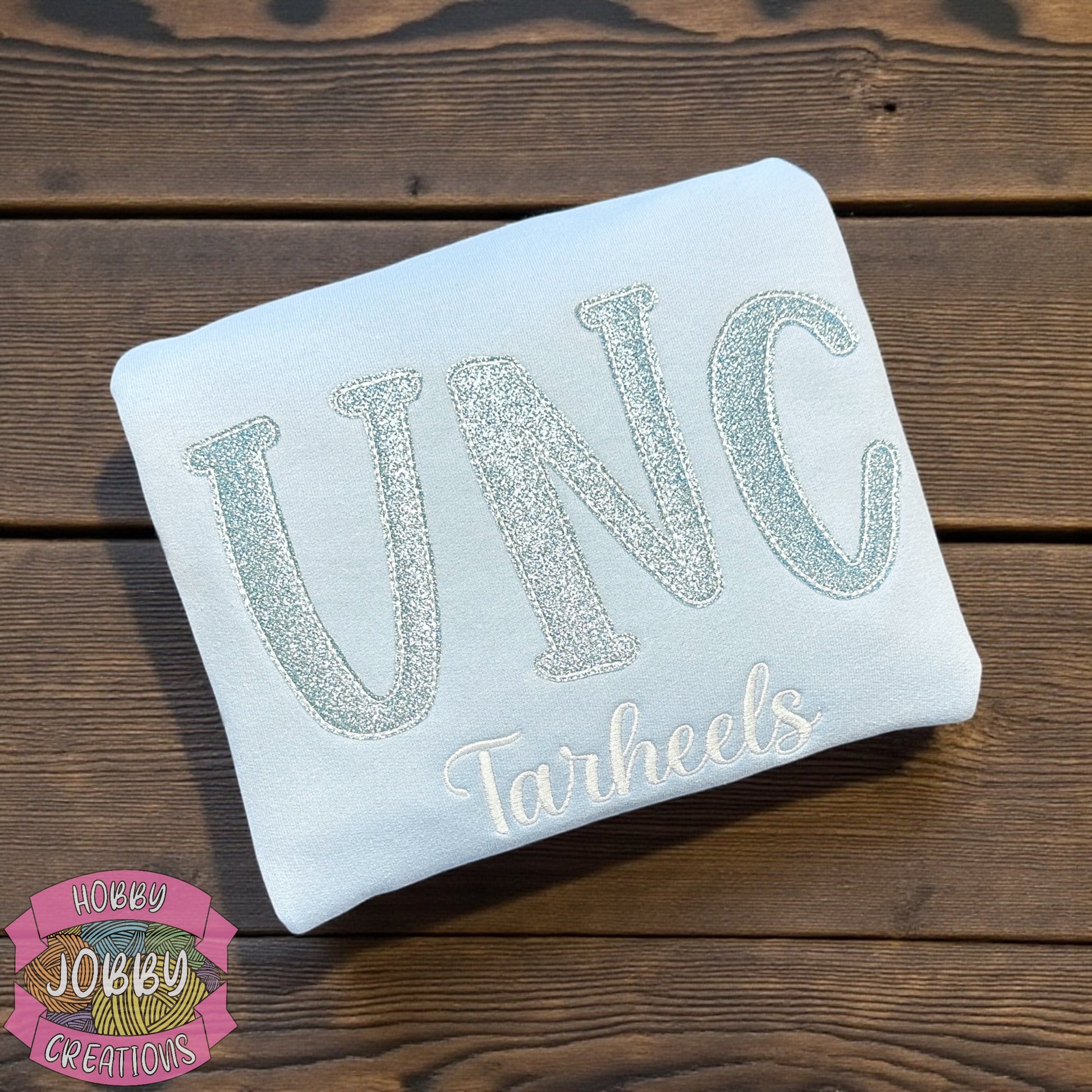 - Your school of choice and mascot is embroidered onto the shirt with glitter applique for that pop of school color